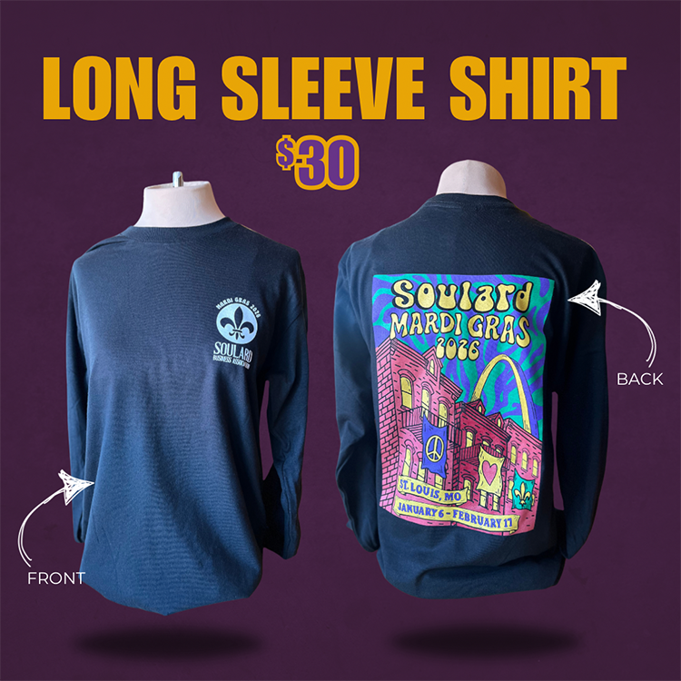 Merchandise can also be found at the following Soulard locations. Each business’ merch will have the same artwork on the back, but will have the logo of the business on the front. Support your local businesses by buying merchandise in person!